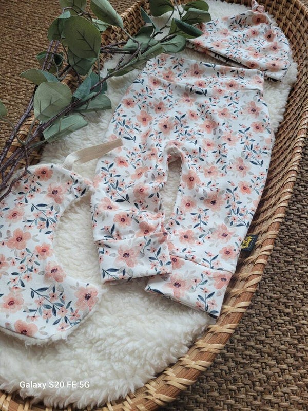 De nieuwste print voor de lieve en zachte broekjes! Zacht roz bloesem met licht groene accenten van de blaadjes. Super mooi printje wat perfect combineer met de kleur nude roze voor een overslag shirtje.