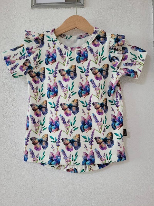 Lieve vlindertjes op een broekje, gecombineerd met een lief tshirtje met ruffles op de schoudertjes in de kleur diep paars of andersom. Broekje paars en shirtje in de vlindertjes