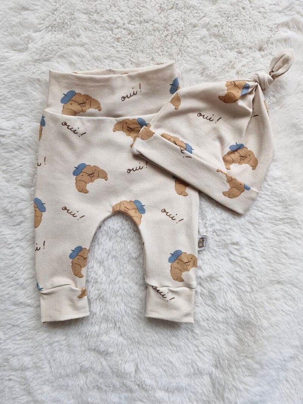 Ah oui!!! croissantjes blauw! Lief broekje, uit te breiden met mutsje of haarbandje